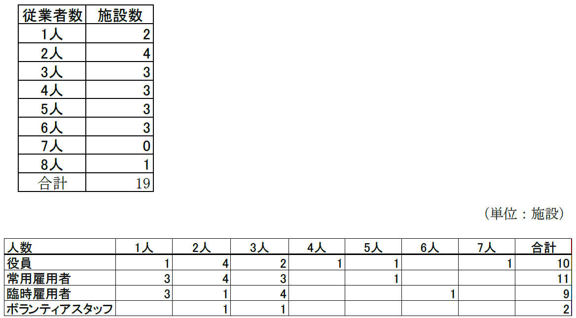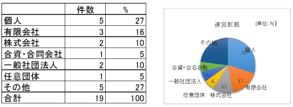 個人で運営を行っているものが5施設(全体の30%)ともっとも多かった。次いで、有限会社3施設(同17%)、株式会社2施設(同12%)と続く。