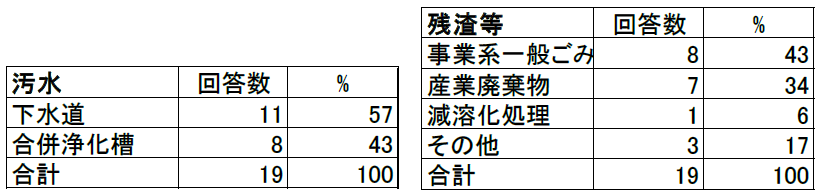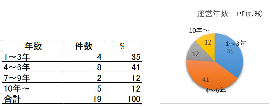 調査した中では、開設から「4~6 年」が7 施設(35%)ともっとも多く、次に「1~3年」が8 施設(41%)であり、開設から6 年以下の加工処理施設が76%を占める。開設から7 年を超える加工処理施設は4 施設(24%)であり、全体として歴史の浅い加工処理施設が多い。