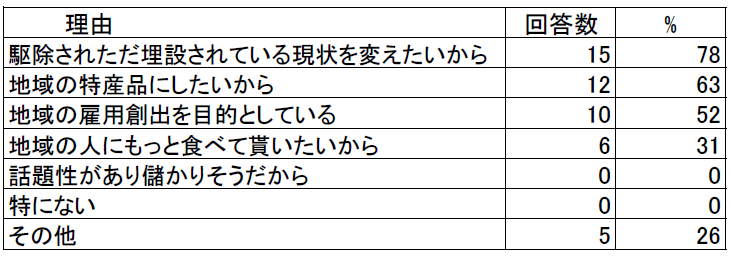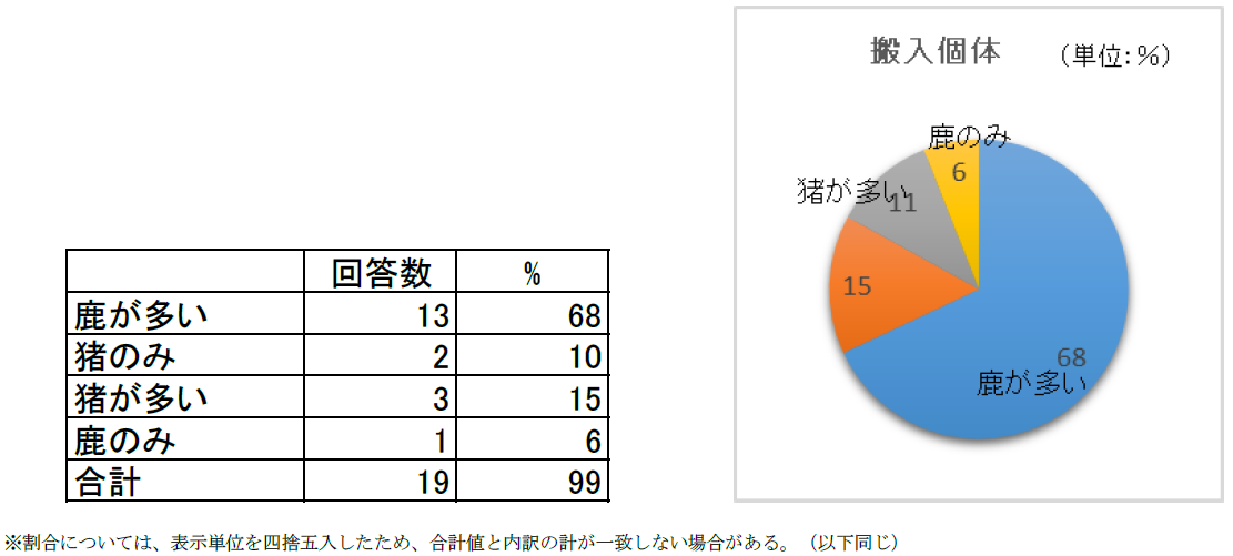 この調査では、鹿の捕獲頭数が多い加工処理施設が半数以上を占めた。(11 施設4%)鹿の処理が多い理由として、年間捕獲数(平成27 年度環境省調べ)は、鹿580,000 頭、猪550,000 頭とあまり差がないが、処理施設で処理された頭数は鹿が55,668 頭に対し、猪は27,476 頭と2 倍の差がある。このことから、鹿の処理する施設が多くなった。 また、「猪のみ」「猪が多い」と回答した施設は5 施設30%あり、年間処理頭数100 頭以下は3施設で最大でも300 頭であった。ヒアリング調査の中でも、冬季以外の猪の利活用が少ない理由として、「肉としての価値がない」といった意見がある他に「猪は処理施設に持ち込まずに自家消費している」、「鹿が増えたら猪が獲れなくなった」といった声がきかれた。