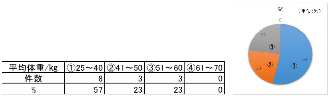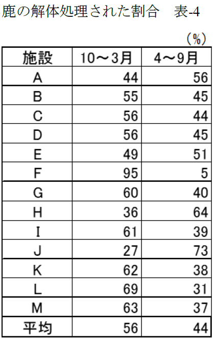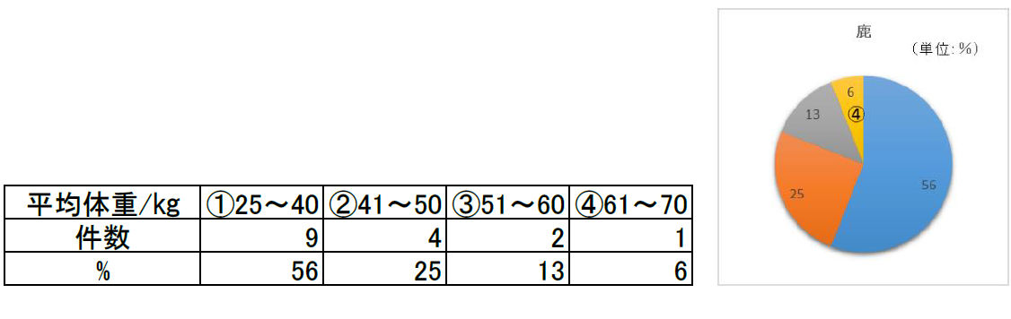 搬入個体の歩留率は鹿が最大40%で最小は14%であった、猪は最大で60%、最小は20%と、なっており、鹿の最小であった14%は肉のトリミングによるもので、猪の最大値である60%は皮や骨の販売を行っているため、他施設より歩留が高い結果となった。