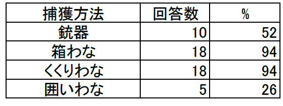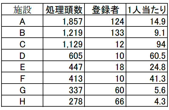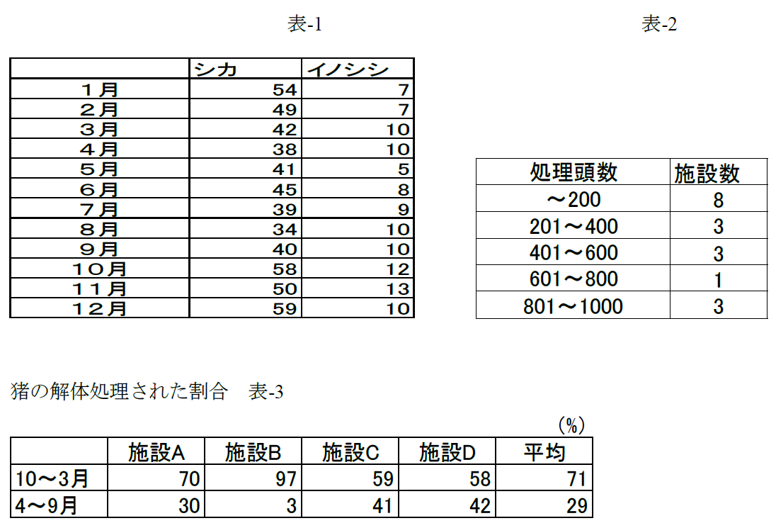 処理頭数1000 頭以上の施設A B は捕獲登録者100 名を超えている公設施設であり、施設C は、民間運営となっている。特徴として、民設民営のC、D、E、F は捕獲登録者は10 名~18 名と少なく、公設施設、猟友会主体の運営施設は捕獲登録者が多い傾向にある。しかし、全ての登録者が日常的に捕獲に従事しているわけではない。