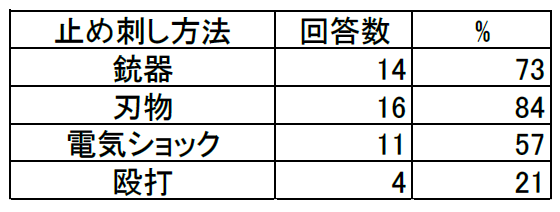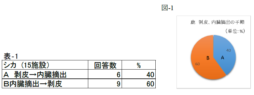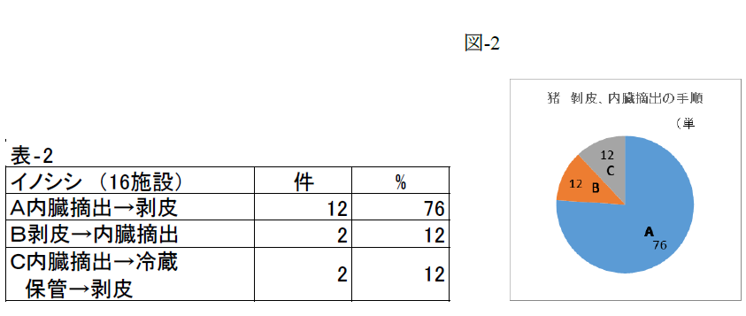 1 次処理した個体を枝肉の状態で冷蔵保管し血抜きや死後硬直の邂逅を行う施設は、76%あり、行わずに直ちに脱骨を行う施設も24%あった。行わない施設は、枝肉を吊るす冷蔵庫がないためである。