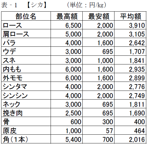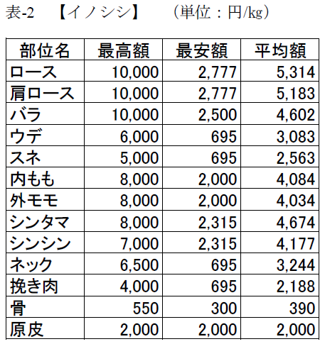 施設Aの猪は猟期のみの個体を扱った典型的な高級路線であり、施設Bは猪を通年捕獲し地元消費を主としている。ターゲットが明確に違うため販売する猪の販売額に差が出ており、また脂ののり具合で価格差が生まれるのも猪肉の特徴である。