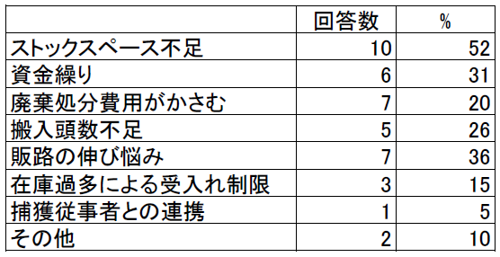 第3に、資金繰りの悪化を招くことである。施設の多くは、個体を捕獲者から買い取り、搬入時または一定期間後に支払いを行う形で仕入れを行う。この場合、施設が商品を販売して現金化する前に、捕獲者に対する支払いが行われる。施設には運転資本が必要となる。この捕獲者への支払いと販売代金の回収の間に生じる逆回転差資金は、事業規模が大きくなり、大量の在庫を抱えるようになればなるほど多額になり、施設経営にボディーブローのように効いてくる。本調査からは、とくに民営施設がこの影響を受けていることが明らかになった。同時に、施設が事業規模の拡大を抑制したいと考える要因としても作用している。