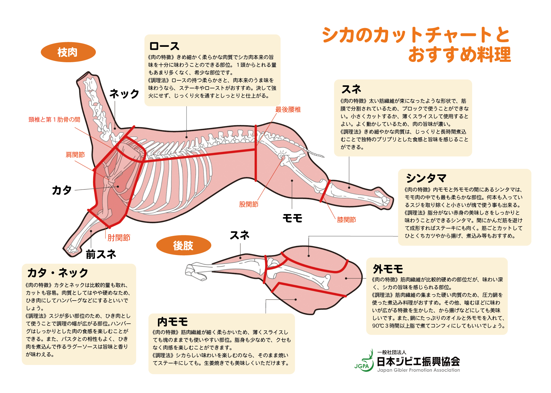 鹿肉は他の食肉と比べ脂肪が少ないヘルシーな食材として関心を集めています。低カロリーなのに高たんぱく、鉄分も豊富で、とってもヘルシー。鹿肉に含まれるヘム鉄と呼ばれる鉄分は人間の身体に吸収されやすく、貧血や冷え性を予防する働きを持っています。メタボが気になる中年男性や育ち盛りのお子様、貧血気味の女性にもぴったりの食材です。