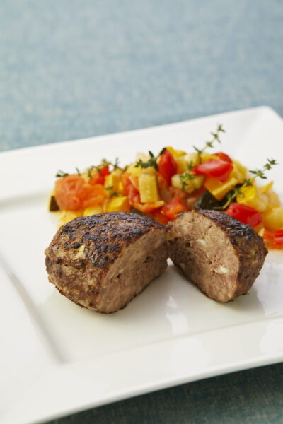 - 串を刺してハンバーグの中から透明な肉汁が出てきたら完成。