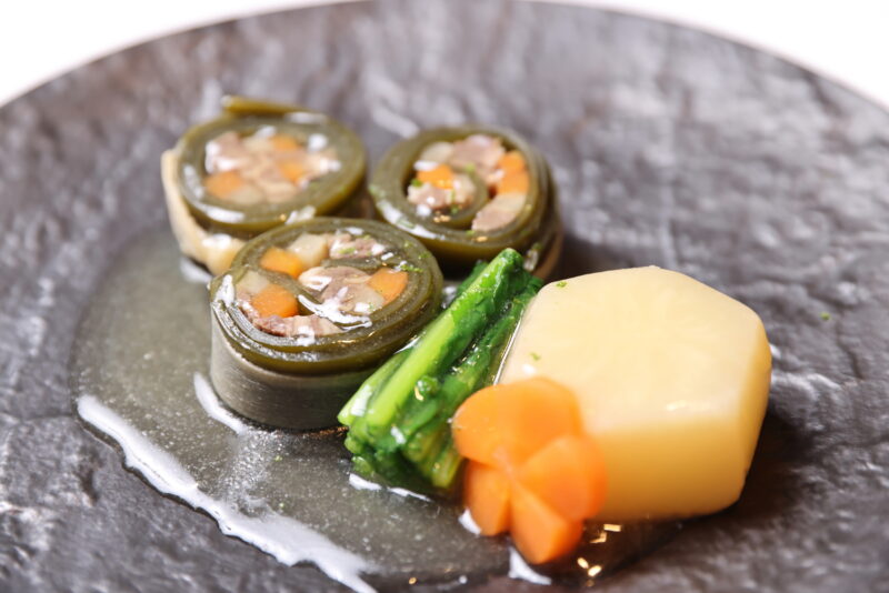 - 水に浸しておいた出汁用の昆布で出汁をとる。