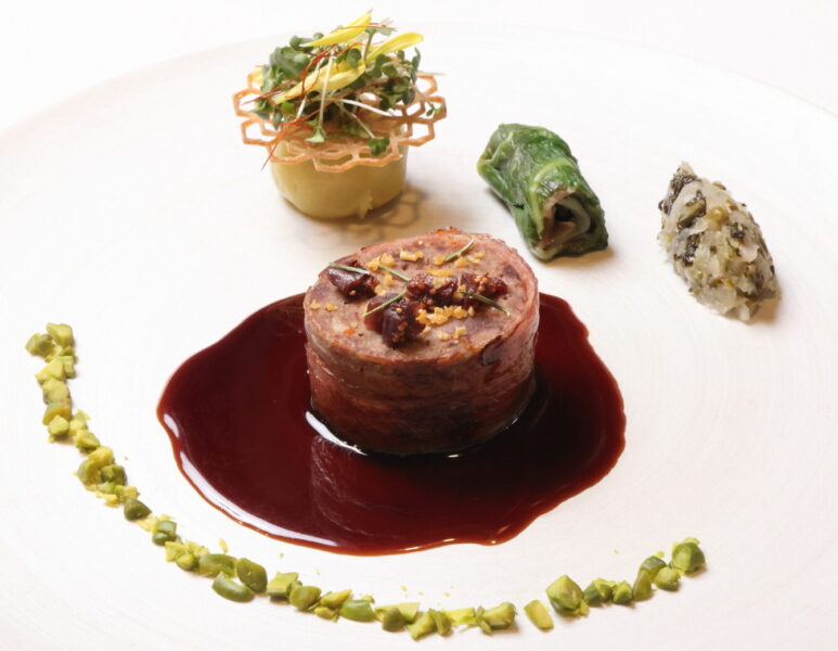 鹿肉と猪肉のミートローフすぐきのラビゴット添え原了郭黒七味香る赤ワインソース西京赤みそ風味