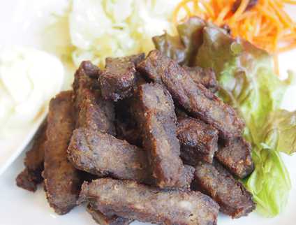 四角いスティックからあげ。市販のから揚げ粉をまぶして揚げる。マヨネーズをつけると美味。パン粉をつけてカツにしても美味しい。