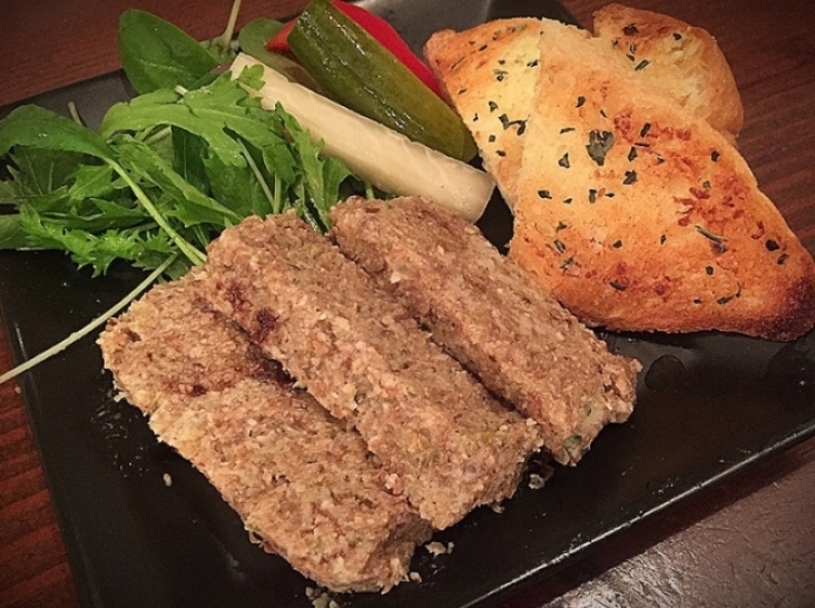 - 固まったら切り分け、付け合わせのベビーリーフ、ピクルス、ガーリックトーストなどを、添えて完成