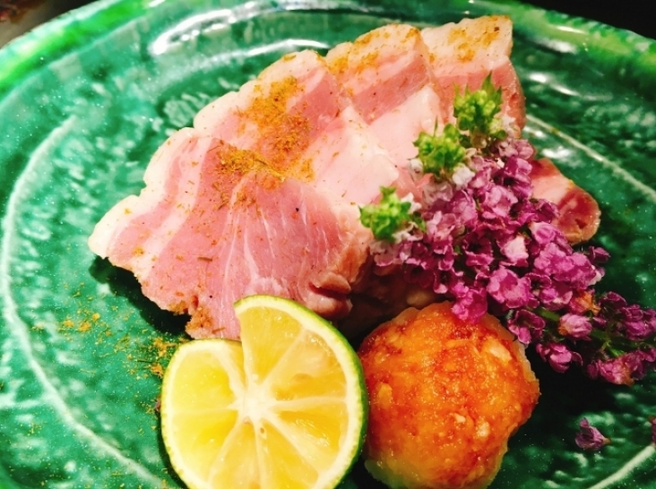 漬け終えた猪肉を取り出し、余分な胡麻味噌を拭き取る。肉の前面をフライパンで軽く焼き(焦げやすいので注意)、真空パックし63度でのお湯に入れ40分加熱する。