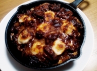 - スキレットにじゃがいも→ベシャメル→猪→チーズ→じゃがいも→ベシャメル→猪→チーズの順に重ね、200度のオーブンで焼き色がつくまで加熱して完成。