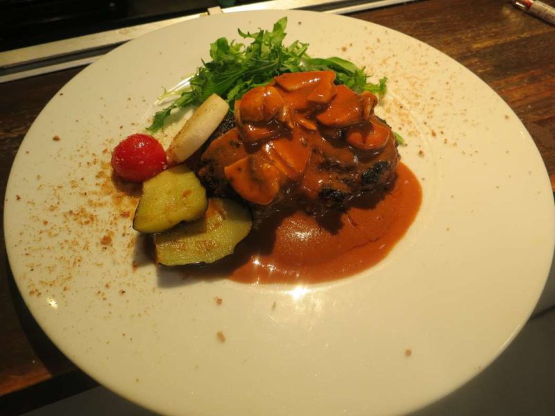 - お皿をレンジで温めて、マッシュルームはハンバーグの上にくるように盛り付け、旬のお野菜を付け合わせに乗せる