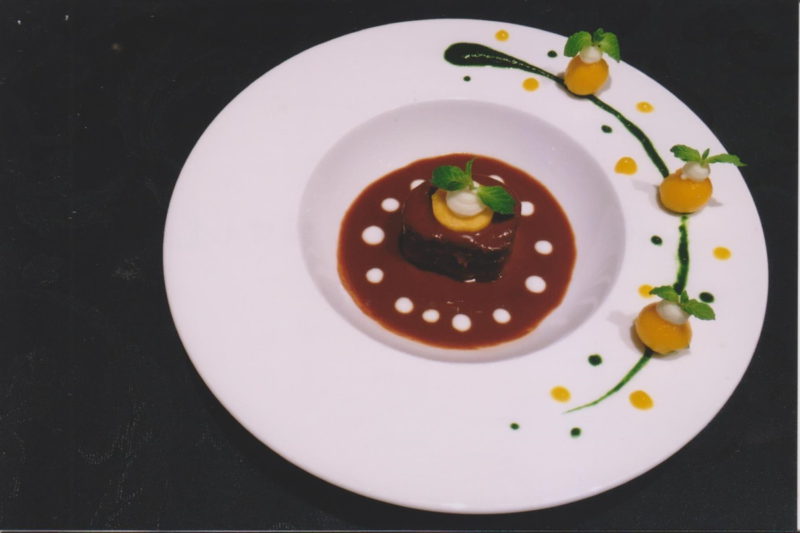 じゃがいものピューレを肉の下に盛り付けソースを注ぎヨーグルトを点、点と流し、周りにミントのピューレ、マンゴーのピューレ、マンゴーの丸型、ミントを盛り付ける。