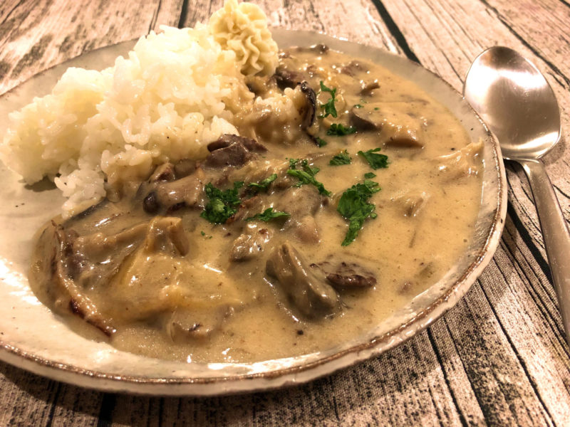 - 4にサワークリームと生クリームを入れ、さらに10分ほど煮込み、水溶き片栗粉でとろみを付ける。