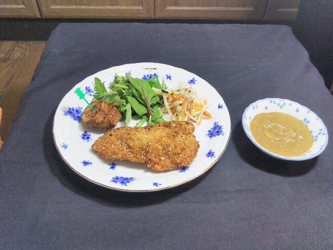 ・付け合せは人参、大根、ズッキーニのせん切りサラダをビネグレットソースで、ベビーリーフと里芋の素揚げに塩コショーし添える