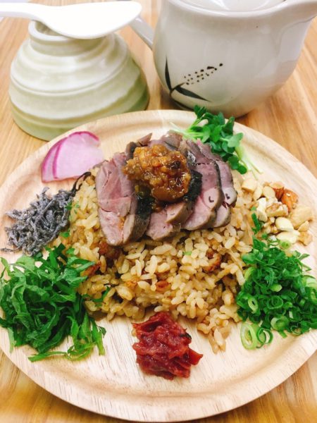 ぼたん鍋風炊き込みご飯です、「山の宝」をひつまぶし風に薬味を混ぜ味に変化をつけながら召し上がっていただきます。