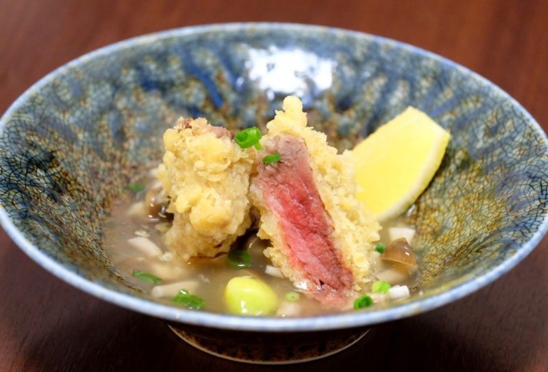 器に温めた餡を入れ、半分にカットしたシカ天を盛り付け、小口にカットした万能ねぎと、くし切りにカットしたレモンを添える。