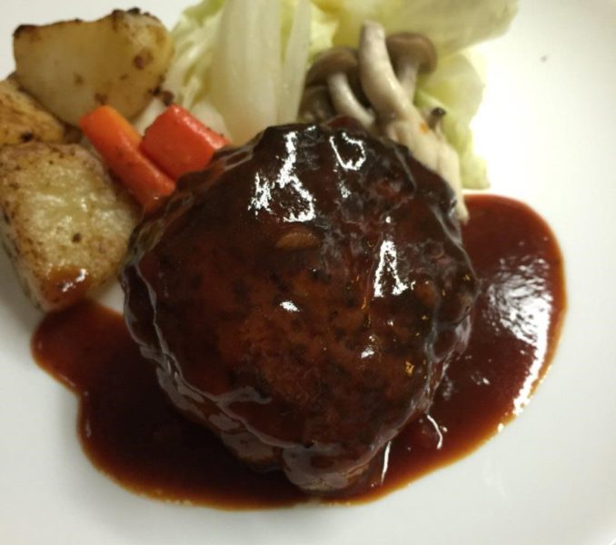 5)付け合せをお皿に盛りハンバーグとソースをバランスよく盛付ける