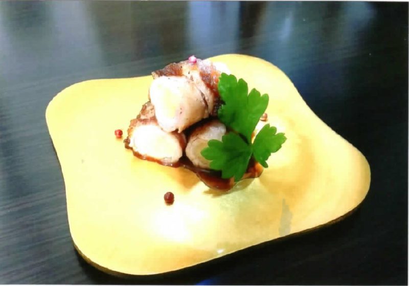 器に盛り付け、ピンクペッパーとイタリアンパセリをのせて完成。