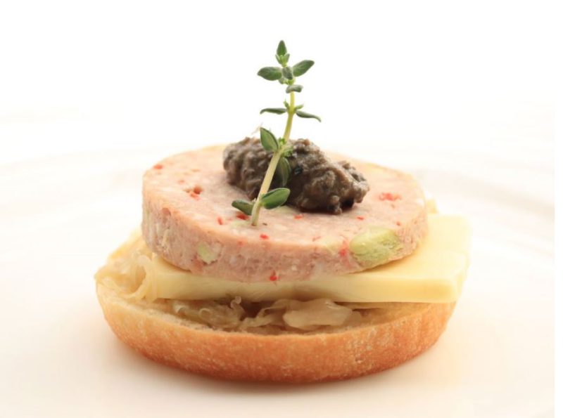 - ラップを2枚重ねて大きく広げ、ラップの短い辺に向きを合わせて ベーコンを少しずつ重ねて並べ、②を乗せ、円筒形に形を整える。