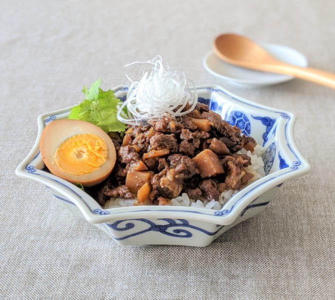 ・ルーロー飯はもともと豚肉のバラ肉を使い、溶けた脂身が美味しい料理ですが、それに比べてあっさりした鹿肉にコクを出すために、黒砂糖や紹興酒を入れ干しシイタケの戻し汁で 煮込みました。なお玉ねぎを入れることで、甘みとトロミも足しています。