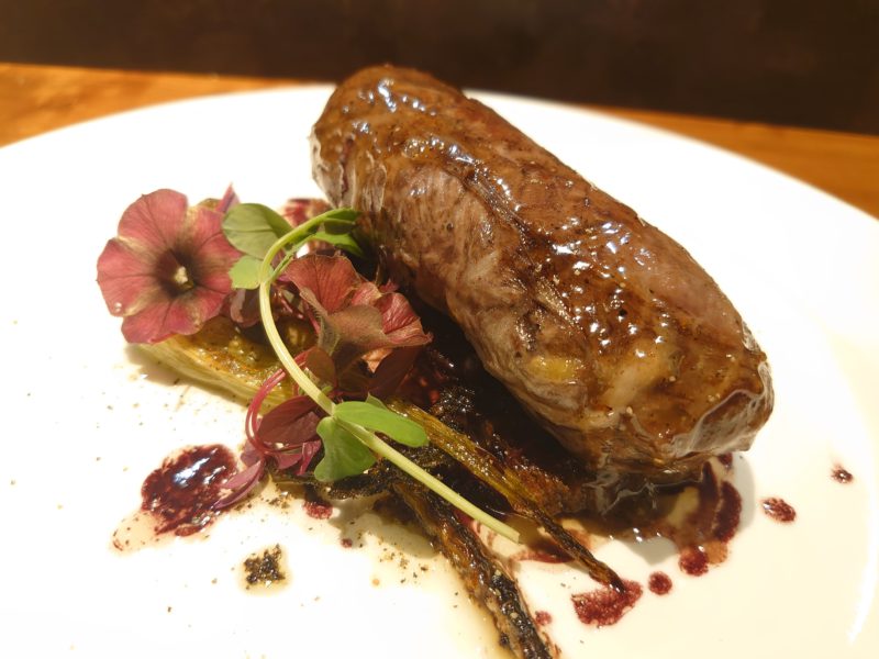 した鹿肉とジャムをシートで包み、外側を網脂で包み、オリーブオイルと共に、真空パックにし、78度のスチームコンベクションオーブンでスチームをかけながら、15 分間火を入れる(中心温度が 75 度になり、一分の加熱を目安とする)。袋から取り出し、フライパンで表面に焼き色をつける。肉汁は、漉して赤ワインに混ぜる。