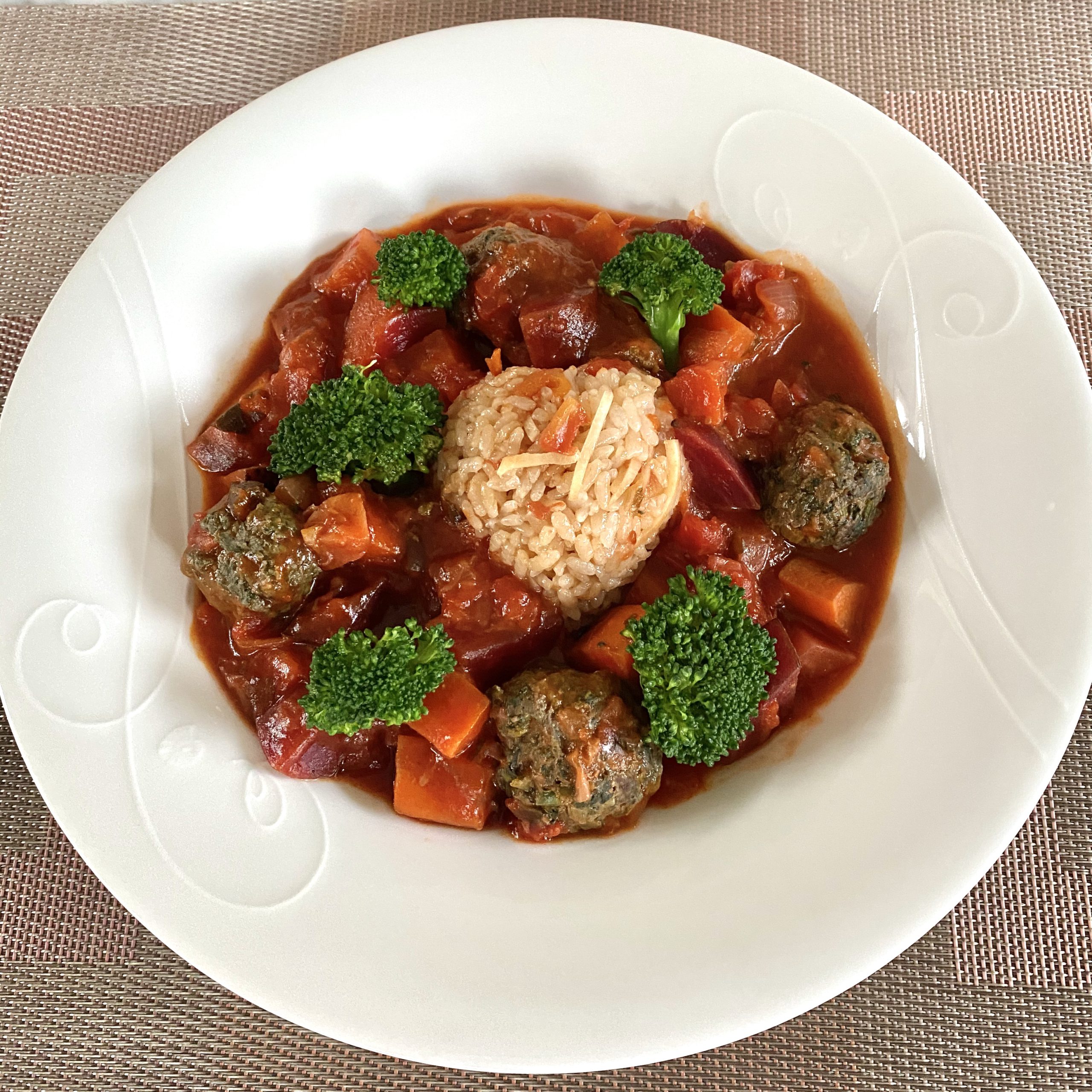 鉄分の多い鹿肉にビーツ、ほうれん草、人参などの「血」に良い食材を合わせてボルシチ風のシチューに仕上げました。煮込み料理にすると固くなりがちな鹿肉を、みじん切りにして包丁で叩くことで柔らかく仕上げ、お子様や高齢者の方々にも食べていただきやすいよう工夫しました。より食べ応えがあるものを好まれる場合は一部をスネ肉に置き換えるとより肉らしさが際立ちます。