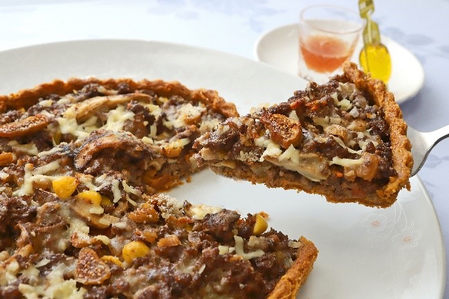 ①ラグーにファルス、カットしたゴーダチーズ、カットした銀杏6 粒を入れて混ぜ合わせ、焼き上げて粗熱を取ったパータ・フォンセに流し入れる。