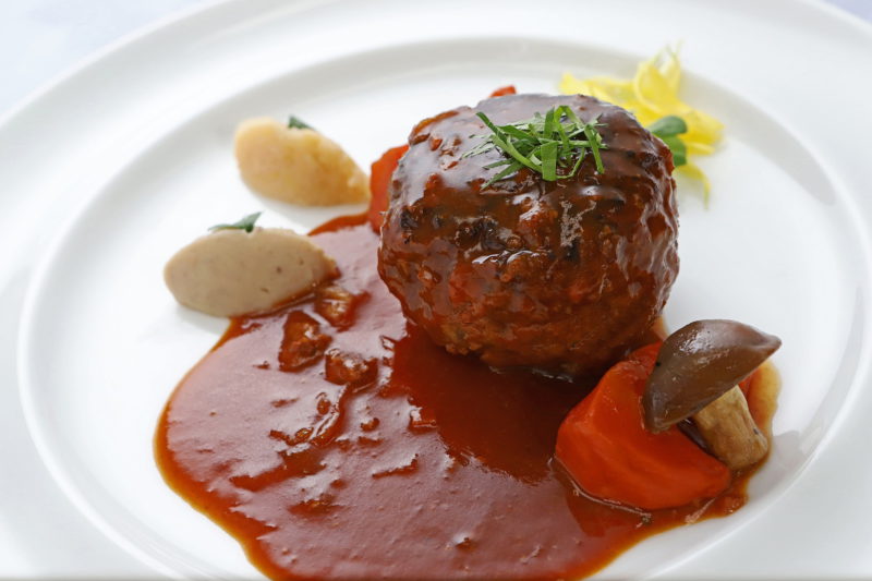 ⑧ハンバーグの上からソースをかけプチマーシュ、菊花を飾りつける。