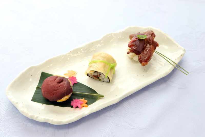 『一口寿し』:猪のそぼろ肉には柚子の風味を加えることで臭みを消しています。