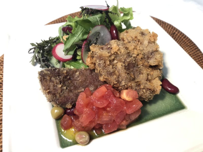 5.バッター液に鹿肉をくぐらせ、パン粉をつけ180℃で揚げる