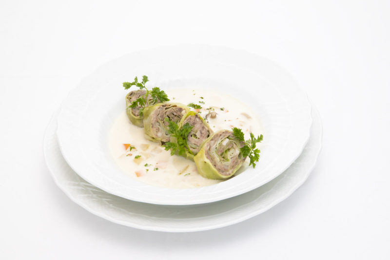 ⑥ ロールキャベツを鍋に戻し、温めてから器に盛りつける。あれば飾りにパセリのみじん切りやチャービルなどを飾る。