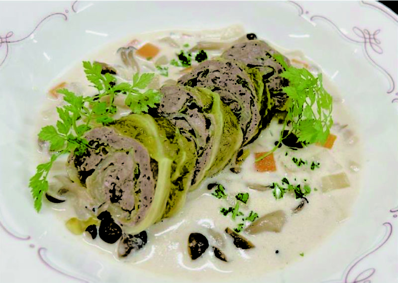 鹿肉のイノシン酸とキノコのグアニル酸によるうまみの相乗効果をいかす事を意識し、どなたにも親しまれているロールキャベツにアレンジしました。