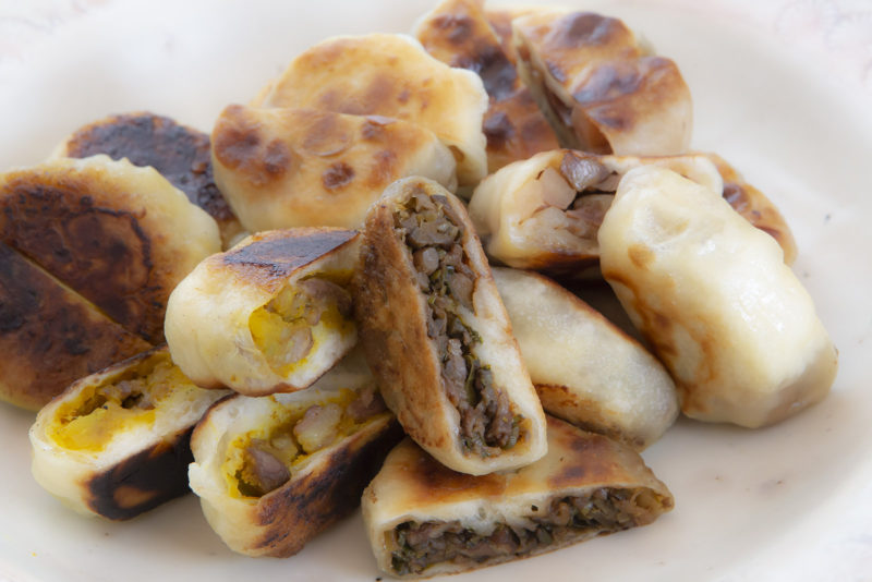 ⑦ おやきが4つ焼けるぐらいのテフロン加工の蓋付フライパンを用意する。フライパンにサラダ油を少々入れて、中火で甜面醤あんのおやきを焼く。両面少し焼き目が付いたら、おやきが1/4程度隠れるぐらい水を入れて蓋をする。弱火で加熱し、水気がなくなる位(10分程)蒸し焼きにする。