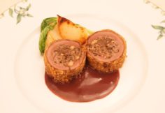 ・エゾシカの被害の1つとしてブドウ畑があります。今回、この料理にはワイン用ブドウの副産物である澱や北海道TEAを使用しています。北海道TEAとは私の地元である北海道で作られているワイン用のブドウの葉を茶葉にしたものです。これをミンチに混ぜ込むことで、カツからもワイン用ブドウ独特の風味を感じることができます。澱は直接北海道のブドウ農家さんからお話を聞かせてもらった際にいただきました。澱はほかのワインよりもうまみ成分が強く、ソースにした際にもブドウのうまみをより強く感じることができます。このようなエゾシカの被害にあっているブドウ畑の副産物を使うことで、エゾシカ被害の認知や生産者様を応援したいという気持ちをこの一皿にのせました。