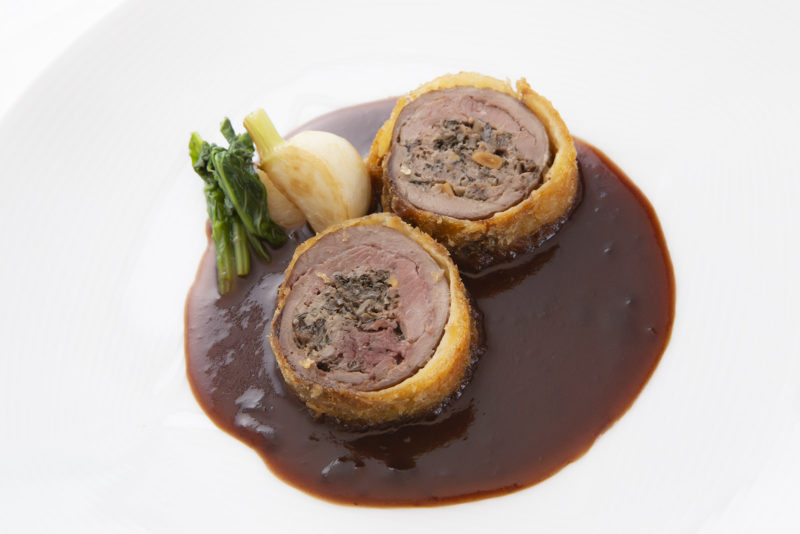 ・今回エゾシカ肉をたくさんの方に食べていただけるよう、カツとハンバーグを組み合わせてロールカツにしました。パサつきがちな鹿肉をミンチにして、油脂をたくさん吸ったしめじを混ぜ込みもも肉で巻きこむことでジューシーに仕上げ、エゾシカのおいしさを二度味わうことができます。単に揚げるのではなく、衣をつける前に一度焼くことで揚げることでは出せない香ばしさをつけています。
