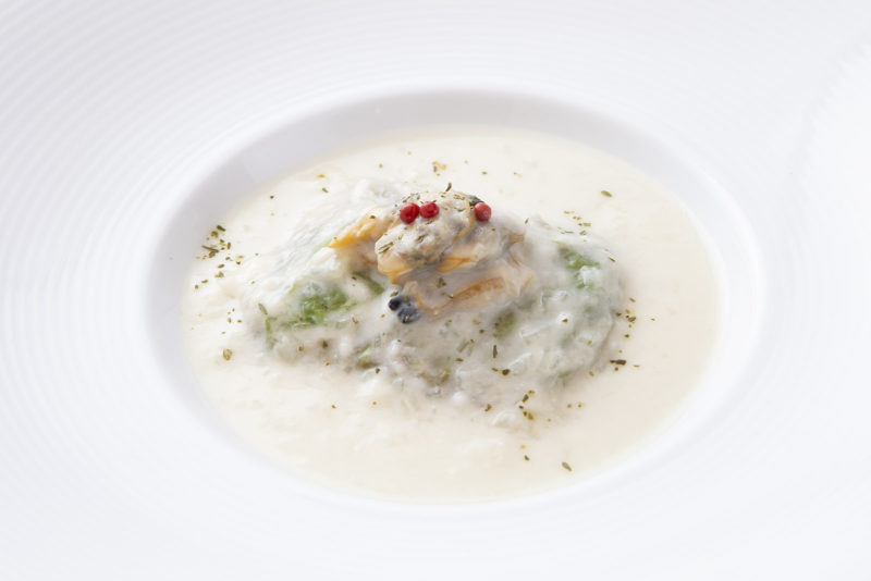 ① 白ワインを火にかけ、煮立ったらアサリを入れる。アサリの口が開いたら取り出し、身を外す。殻は捨て、外した身は牛乳の一部に漬ける。煮切ったワインに昆布茶粉末と鶏ガラスープの素を溶かす。