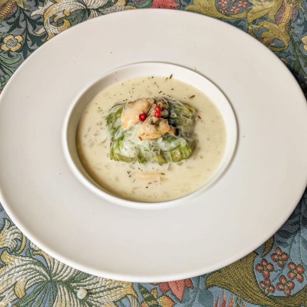 ⑩ 皿にスープを少し入れ、中央にレタス包み置く。周囲にスープを流す。レタス包みの上にアサリとピンクペッパー、クミン、タイムを飾る