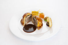 今回使用した部位はバラ肉です。実際自分で様々な部位を食べ比べた際、1番美味しいと思ったのがバラ肉だったので選択しました。ただちょっと味が強いと感じたので、最後まで飽きずに食べられるように、コンソメで煮込んだ大根とシイタケでサンドしました。パイの余分な隙間には、今が旬 のきたあかりと根セロリのピューレで埋めパイで包みました。ソースはハスカップがほのかに香る仕上がりにし、ジビエの時期に旬を迎える食材でガルニチュールを作りました。北海道にはいないイノシシと北海道の食材を掛け合わせた僕なりの一皿です。