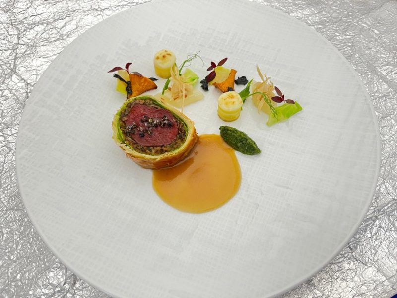 うま味溢れるように焼き上げた鹿肉とパイ生地のサクサク感、さわやかな柚子が効いたソース、まとまりのある付け合わせと、すべてが味、見た目はもちろん、栄養面でもバランスよく仕上げられたと思います。