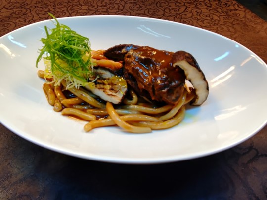 ④ 皿に盛り付けたパスタと鹿スネ肉、原木椎茸の上にサラダを盛り付ける。その上に新鮮な柚子の皮を削りかけて完成。