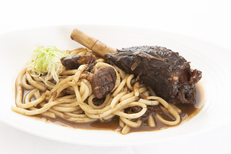 ① パスタを仕上げる鍋に鹿の骨付スネ肉の煮込みを入れ、軽く煮詰める。