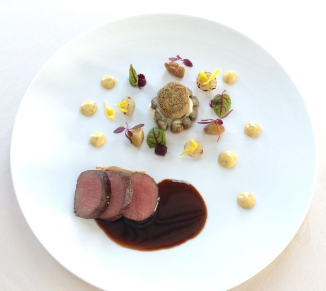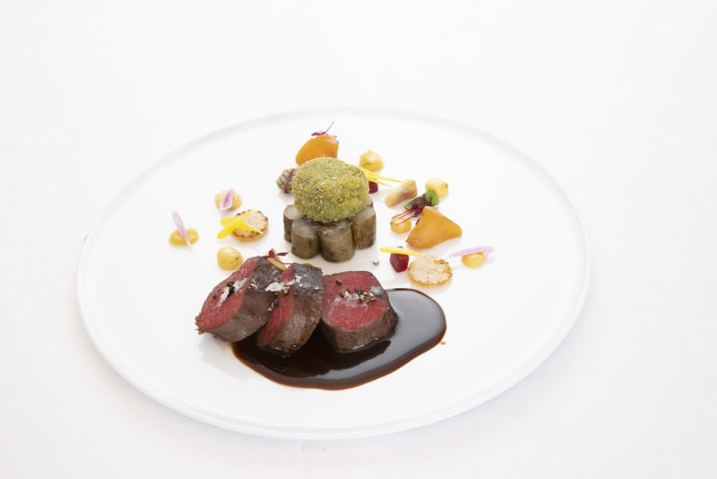 6. 上記の周りにビーツのマリネ、和栗のエチュベ、菊芋のソテーを盛り付け飾りも添える。