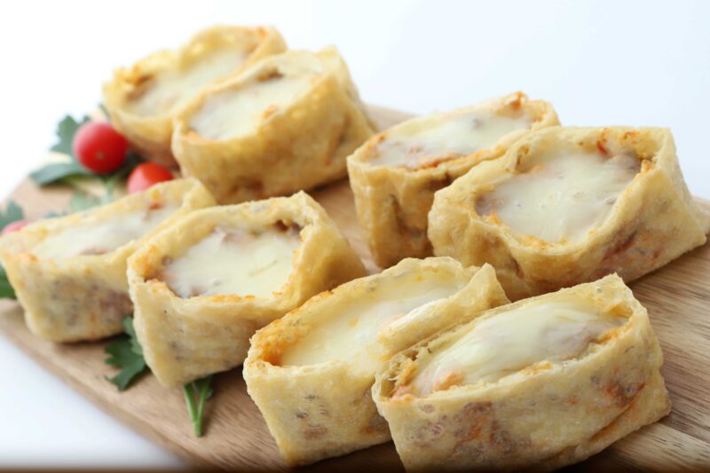 ⑫半分に切った油揚げの中に具材を8 分目から9 分目まで詰め、スキレットの中に並べ、それぞれにチーズをお好みで載せる。
