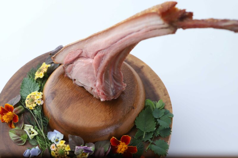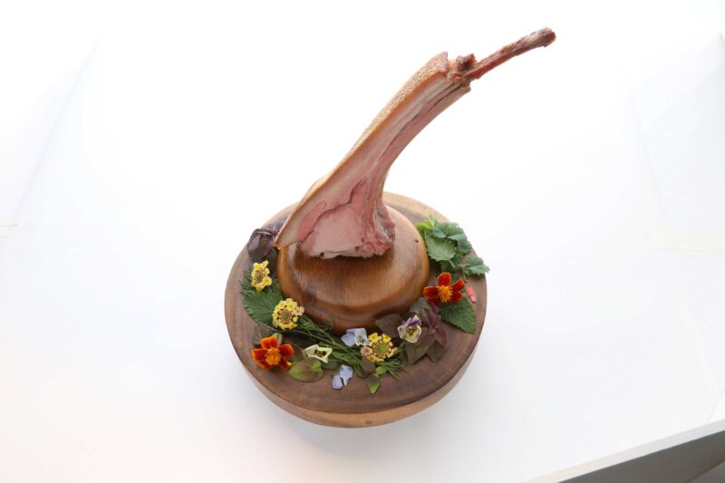 ⑤④の骨と骨の間でカットし、エディブルフラワーと盛り付けて完成。