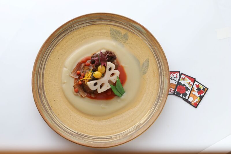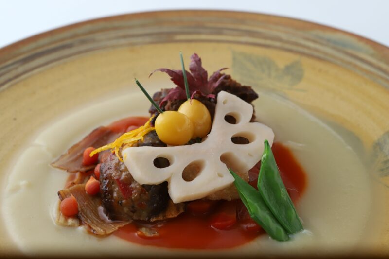 花札の猪鹿蝶をモチーフにして「萩に猪」「紅葉に鹿」「牡丹に蝶」を表現しました。素揚げ牛蒡と球状の人参で萩、人参の飾り切りで牡丹、蓮根の飾り切りと松葉銀杏で蝶を作っています。人参ソースの鮮やかな紅と筍ソースの黄で全体を包んで、色づく秋の情景にまとめました。