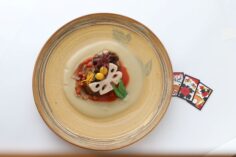 【レシピについて】日本の家庭の定番料理である筑前煮。筑前煮の鶏を猪と鹿に置き換えて別の形に再構築させた一皿です。筑前煮は地域によってがめ煮とも呼ばれ、入れる具材も少しずつ変わります。何より家庭それぞれの味があり、おばあちゃんの味、給食の味・・・誰もが思い出を持っていることでしょう。そんな筑前煮を要素に分解し意外な形で再構築してみせることで、食べ手にそれぞれの思い出を楽しんでもらえたらと思って作りました。この料理は作り手が作り込むのは7割、あとは食べ手が想像をふくらませることによって完成する料理と言えます。