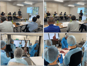 その後は、国産ジビエ認証第3号・信州富士見高原ファームの戸井口氏によるガイドラインに沿ったジビエの解体処理方法や精肉処理の実演講習。参加者の皆様からは施設の運営方法や国産ジビエ認証の取得について、止め刺し方法、解体時の衛生管理などたくさんのご質問をいただき、活気のある研修会となりました。